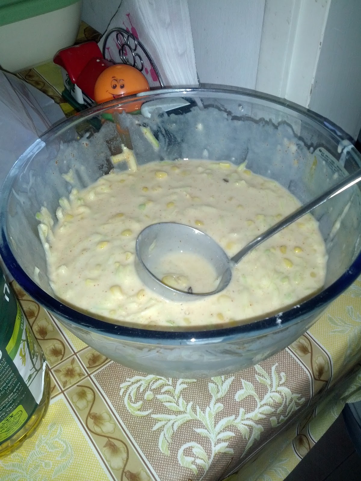 Смешала все кроме кабачка, получилось жидкое тесто. Натерла кабачки и добавила их в посуду с тестом, перемешала... Что то, чего то не хватает. Добавила зерна кукурузы (у меня замороженные были). Потом решила добавить немного паприки и куркумы, зачем? Не знаю, захотелось!